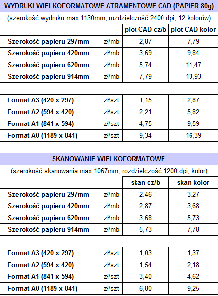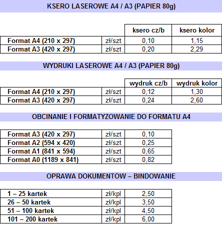* Podane kwoty są cenami netto, * Przy zleceniach nietypowych kalkulacja kosztów wykonywana indywidualnie, * Rabaty dla stałych klientów